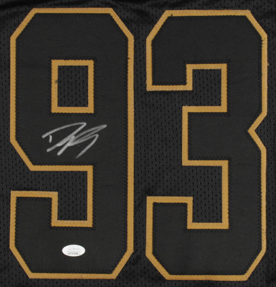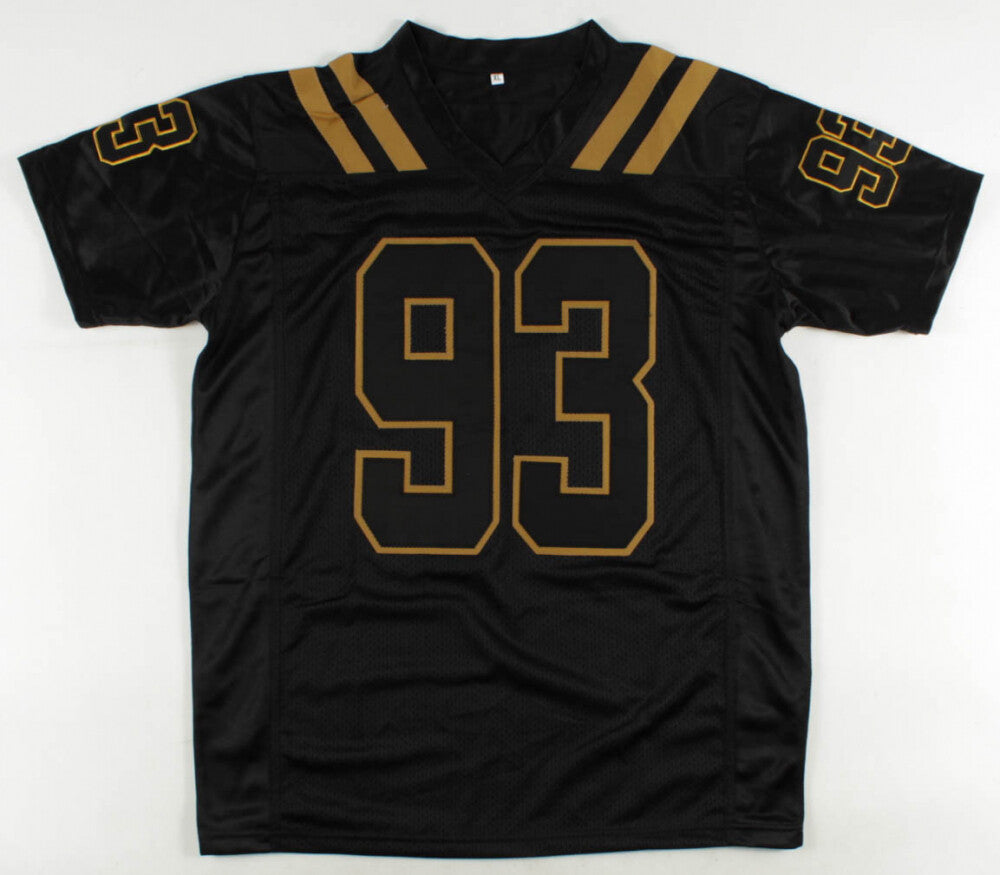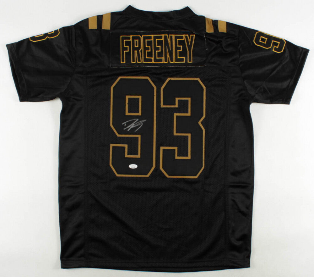 Custom on-field style jersey. Everything is sewn on, size XL. Hand-signed in silver paint pen by Dwight Freeney.