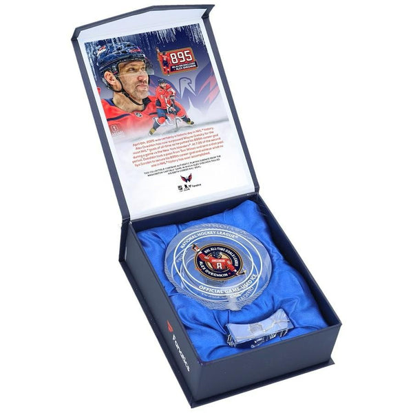 Ice was game-used during the game that Alexander Ovechkin recorded his 895th goal. Encapsulated in a crystal hockey puck and distributed by Fanatics.