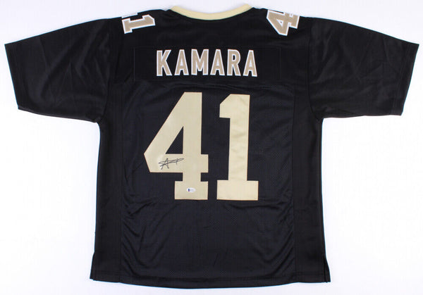 Custom on-field style jersey. Everything is sewn on, size XL. Hand-signed in black felt-tip pen by Alvin Kamara. The lot / autograph(s) includes an official Beckett Authentication Services serially numbered...
