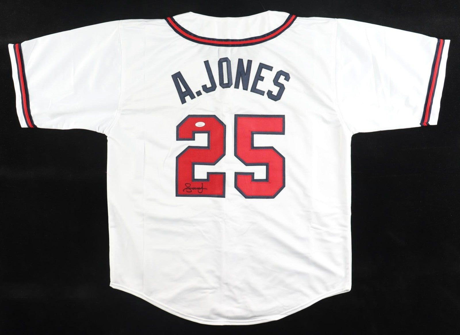 Custom on-field style jersey. Everything is sewn on, size XL. Hand-signed in black felt-tip pen by Andruw Jones.