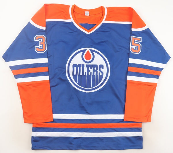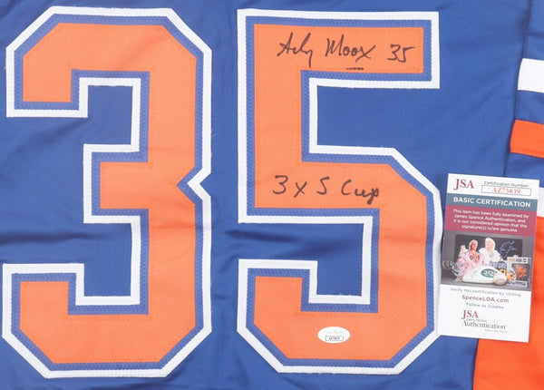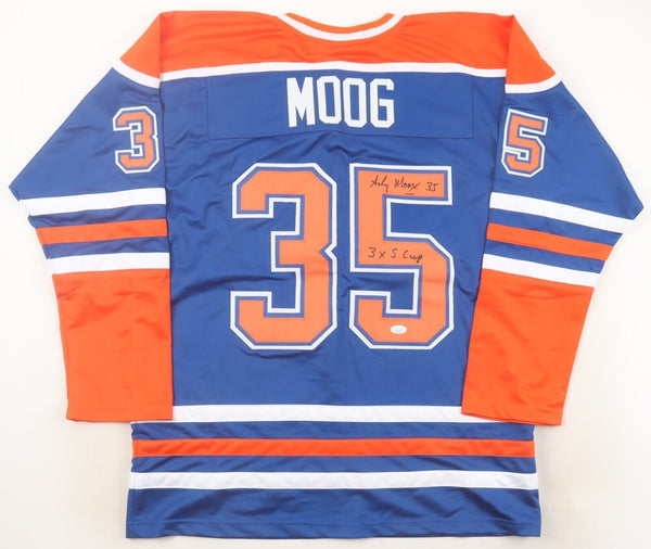Andy Moog Signed Edmonton Oilers Blue Jersey (JSA COA) 4xStanley Cup Champion