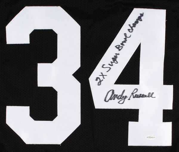 Custom on-field style jersey. Everything is sewn on, size XL. Hand-signed and inscribed in black felt-tip pen by Andy Russell. The lot / autograph(s) includes an official Total Sports Enterprises...