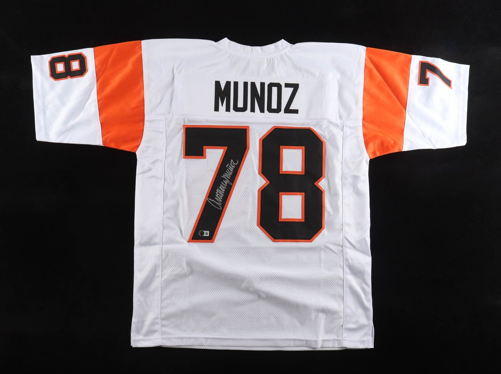 Custom on field style jersey with everything sewn on, size XL. Hand-signed by Anthony Munoz (Cincinnati Bengals, Tampa Bay Buccaneers, HOF).