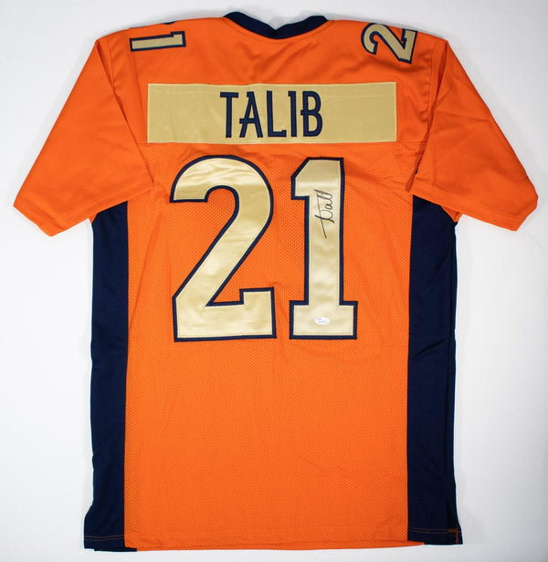Custom on-field style jersey. Everything is sewn on, size XL. Jersey has been hand-signed in black felt-tip pen by Aqib Talib. The lot / autograph(s) includes an official James Spence...