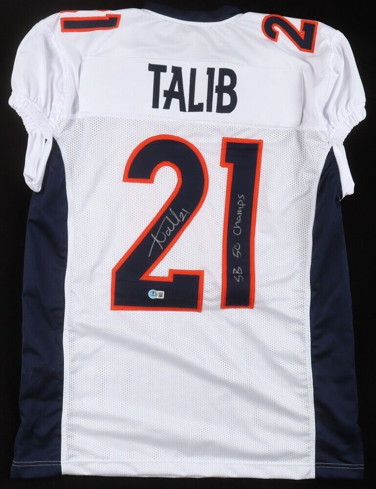 Custom on-field style jersey. Everything is sewn on, size XL. Jersey has been hand-signed by Aqib Talib.