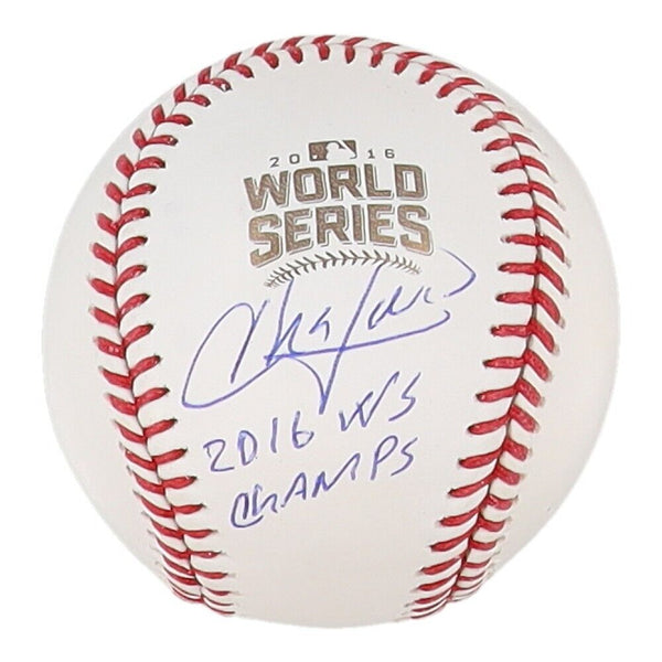 Rawlings Official 2016 World Series Logo baseball. Hand-signed and inscribed by Aroldis Chapman (New York Yankees, Chicago Cubs). The autograph includes an official James Spence Authentication (JSA) hologram and QR...