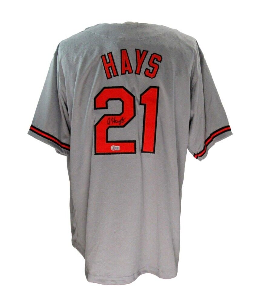 Custom on-field style jersey. Everything is sewn on, size XL. Has been hand-signed by Austin Hays.