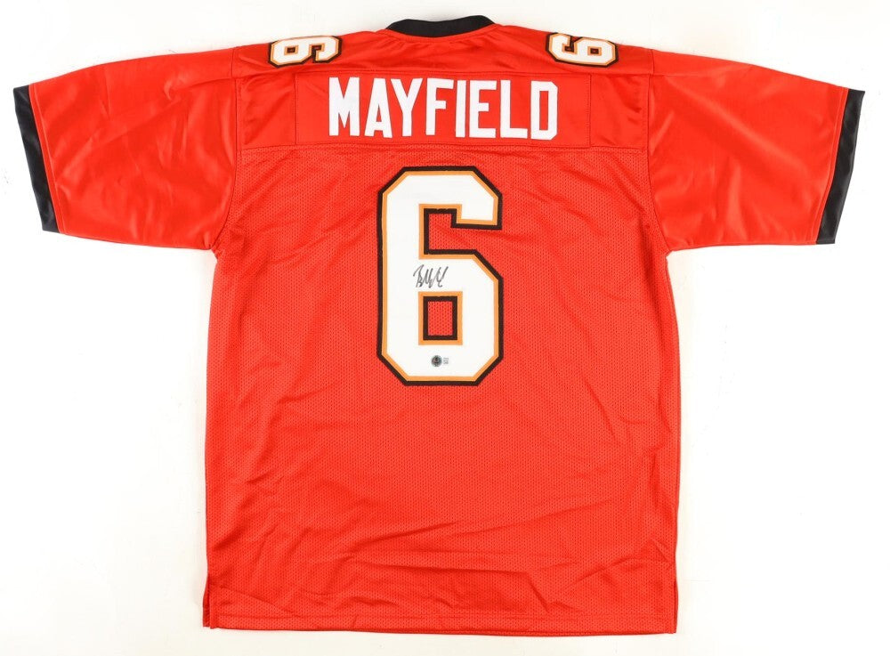 Custom on-field style jersey. Everything is sewn on, size XL. Hand-signed by Baker Mayfield.