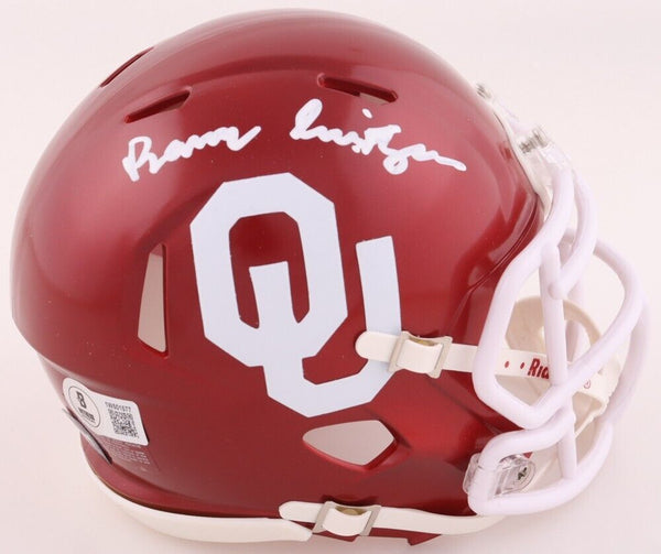 Riddell Oklahoma Sooners Speed mini helmet. Hand-signed by Barry Switzer. The autograph includes an official Beckett Authentication Services serially numbered hologram as well as an official Prova hologram for authenticity...