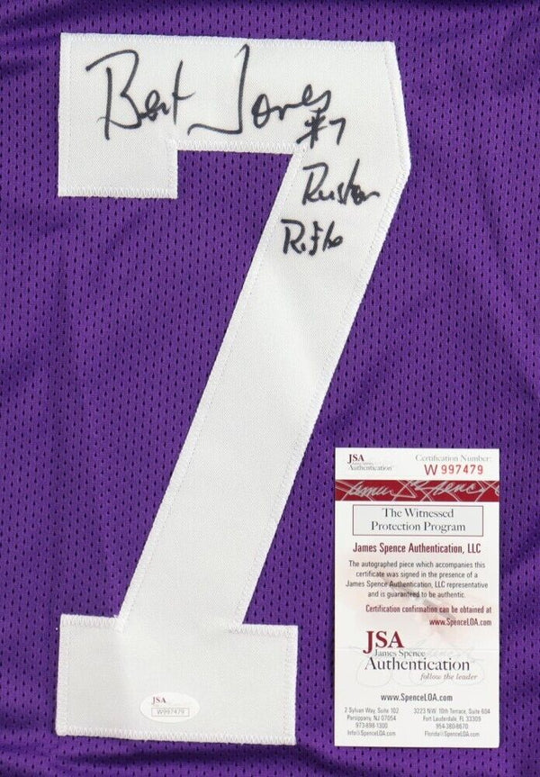 Custom on-field jersey. Everything is sewn on, size XL. Hand-signed and inscribed by Bert Jones. The autograph(s) includes an official James Spence Authentication (JSA) hologram and matching COA for authenticity...