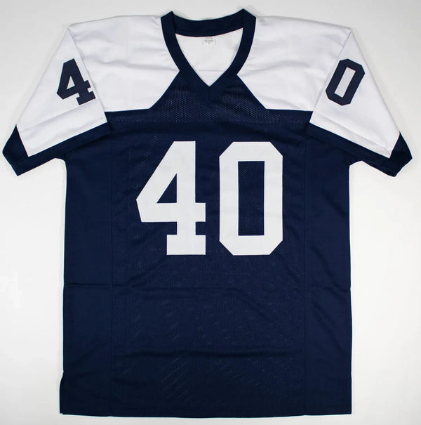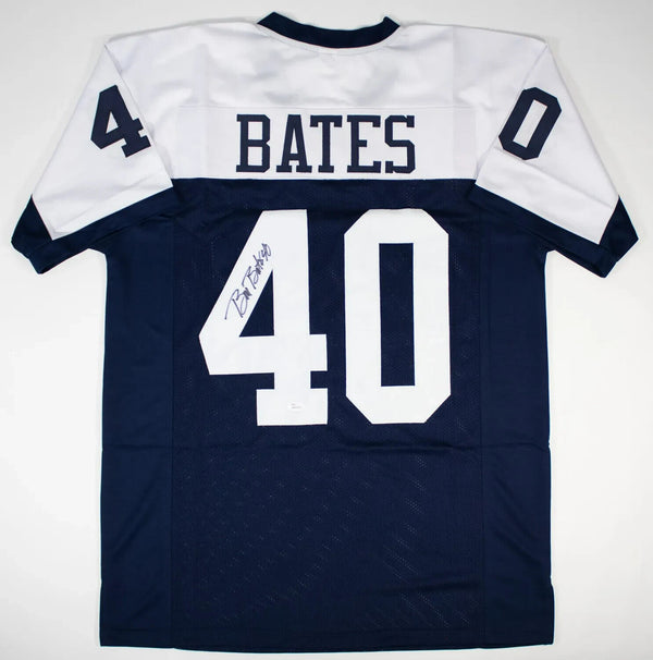 This autographed custom on-field style adult XL Throwback jersey has been personally hand-signed by Bill Bates of the Dallas Cowboys. This autograph is certified by James Spence Authentication?s (JSA) Witnessed...