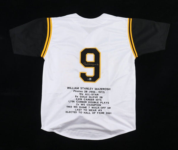 Custom on-field style jersey. Everything is sewn on, size XL. Hand-signed gold paint pen by Bill Mazeroski (Pittsburgh Pirates, HOF 2001). This autograph is certified by Beckett Authentication Services (BAS)...