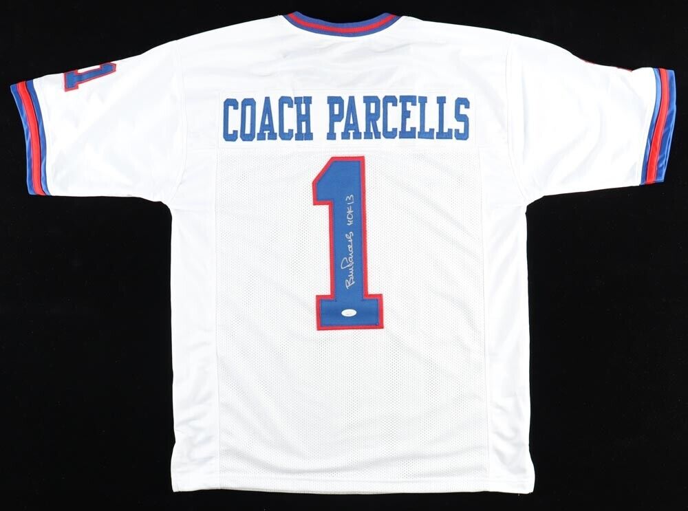 Custom on-field style jersey. Everything is sewn on, size XL. Hand-signed in black felt-tip pen by Bill Parcels.