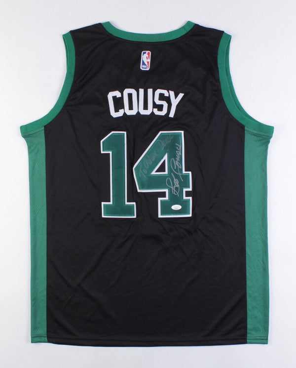 Custom on-court Nike style jersey. Everything is sewn on, size XL. Hand-signed and inscribed by Bob Cousy (HOF). The lot / autograph(s) includes an official James Spence Authentication (JSA) hologram...