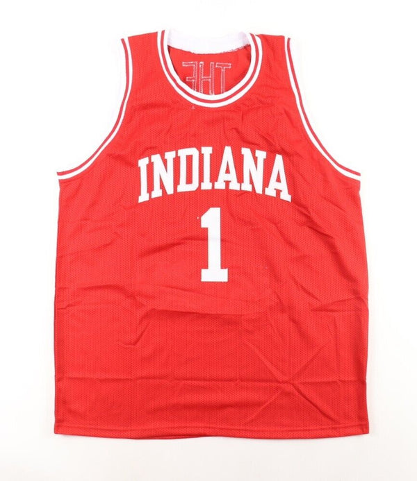 Custom on-court style jersey. Everything is sewn on, size XL. Has been hand-signed by Bobby Knight (HOF). Knight's career highlights have been custom stitched onto the back of the jersey below...