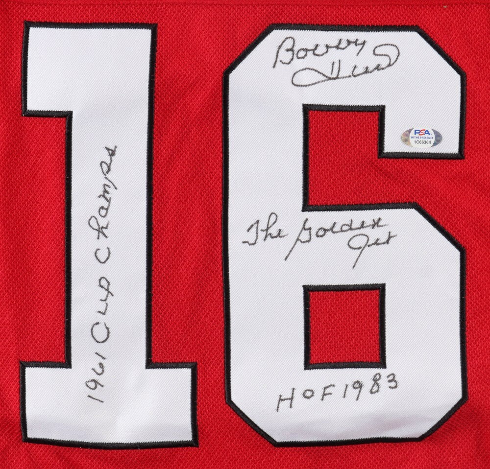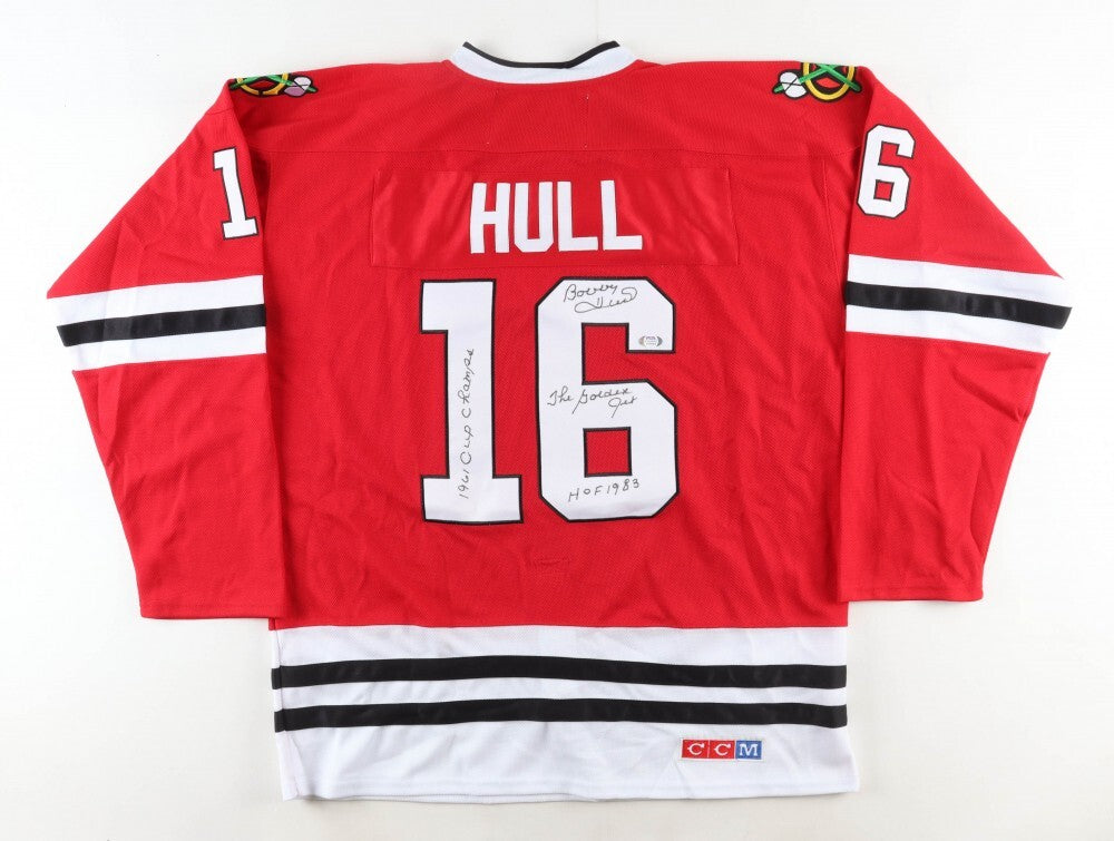 Bobby Hull Signed Chicago Blackhawks Triple Inscribed Rare #16 Jersey (PSA COA)