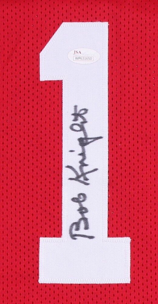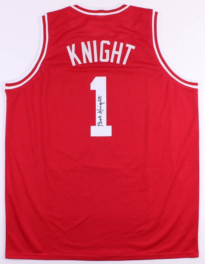 Custom on-court style jersey. Everything is sewn on, size XL. Has been hand-signed by Bobby Knight (HOF).