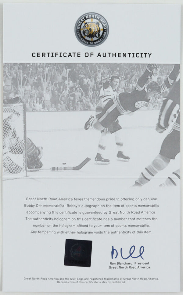 Boston Bruins official NHL logo hockey puck is hand-signed by Bobby Orr (HOF). The autograph includes an official Bobby Orr hologram and matching COA from Great North Road for authenticity...