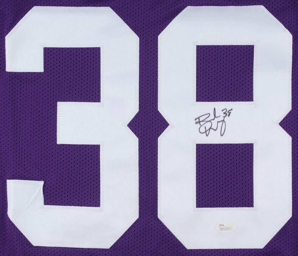 Custom on-field style jersey. Everything sewn on, size XL. Hand-signed in silver paint pen by Brad Wing.