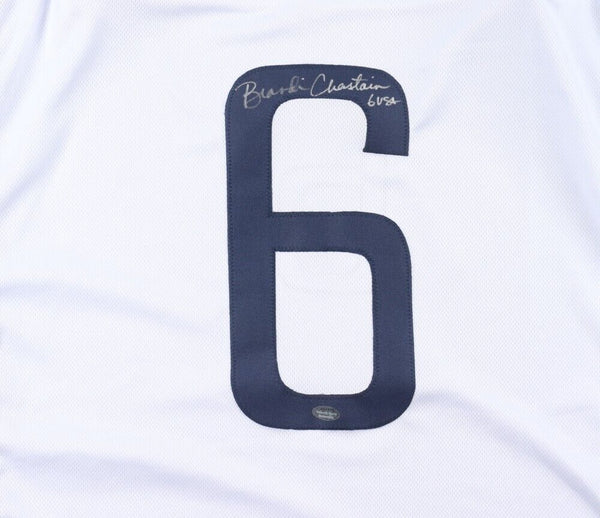 Custom on-field style jersey. Everything sewn on, size XL. Hand-signed and inscribed by Brandi Chastain.The autograph(s) includes an official Schwartz Sports Hologram and matching COA for authenticity purposes.Authentication: Schwartz Sports COA