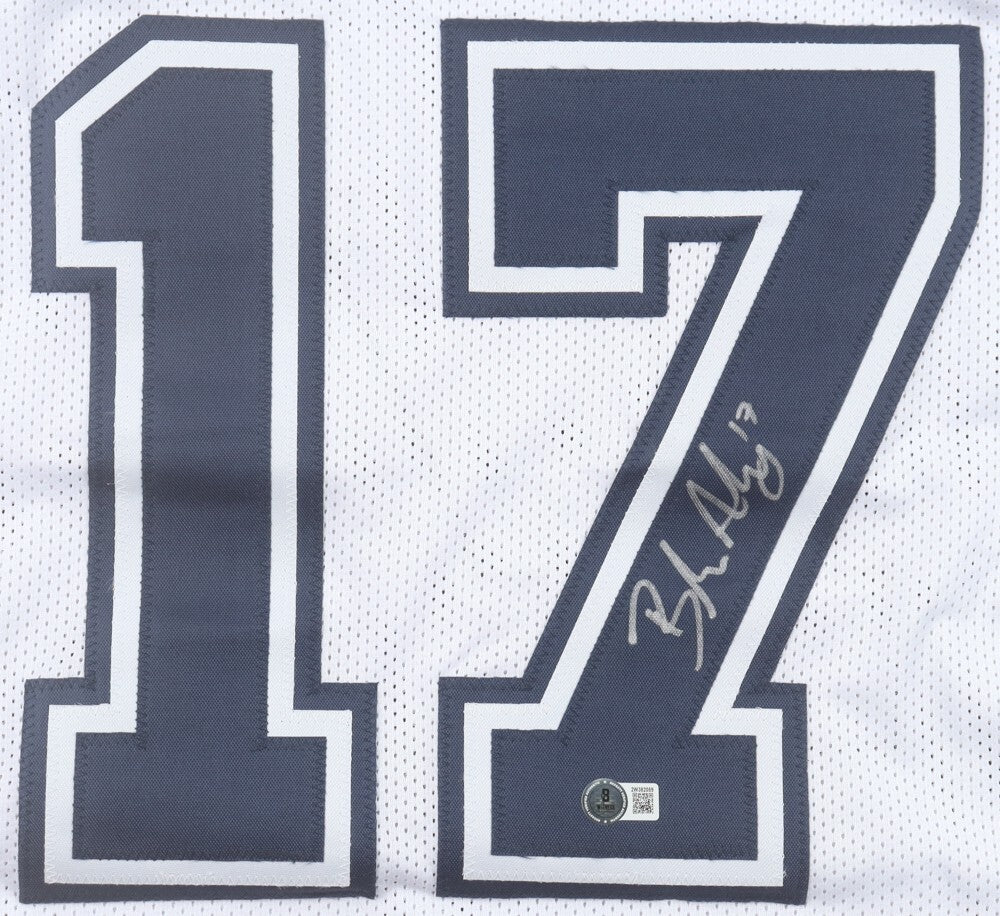 Custom on-field style jersey. Everything is sewn on, size XL. Hand-signed in silver paint pen by Brandon Aubrey.
