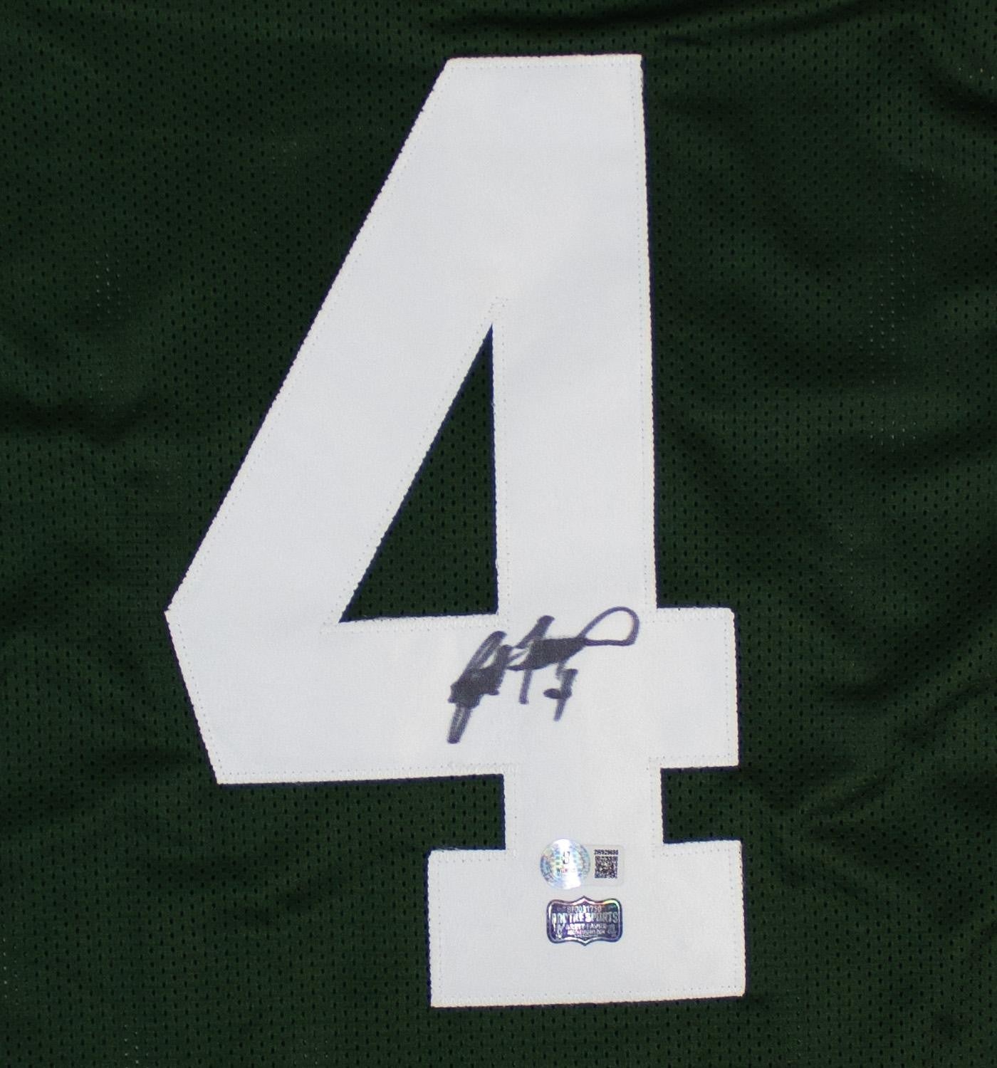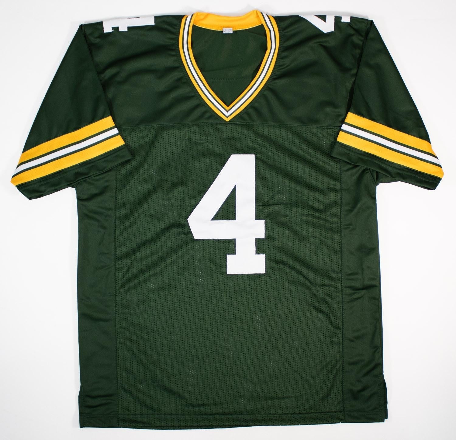 This autographed custom 0n-field style Adult XL jersey has been personally hand-signed by Brett Favre of the Green Bay Packers.