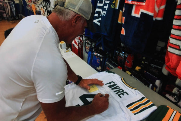 This autographed custom 0n-field style Adult XL jersey has been personally hand-signed by Brett Favre of the Green Bay Packers. This autograph is certified by Beckett Authentication Services (BAS) Witness Certification....