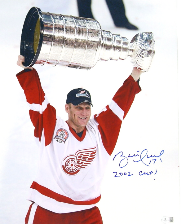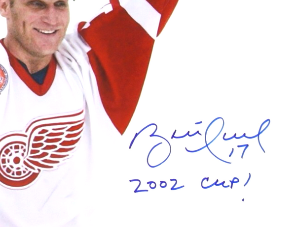 Brett Hull Signed Detroit Red Wings 16x20 Photo Inscribed HOF 2002 Cup (Beckett)