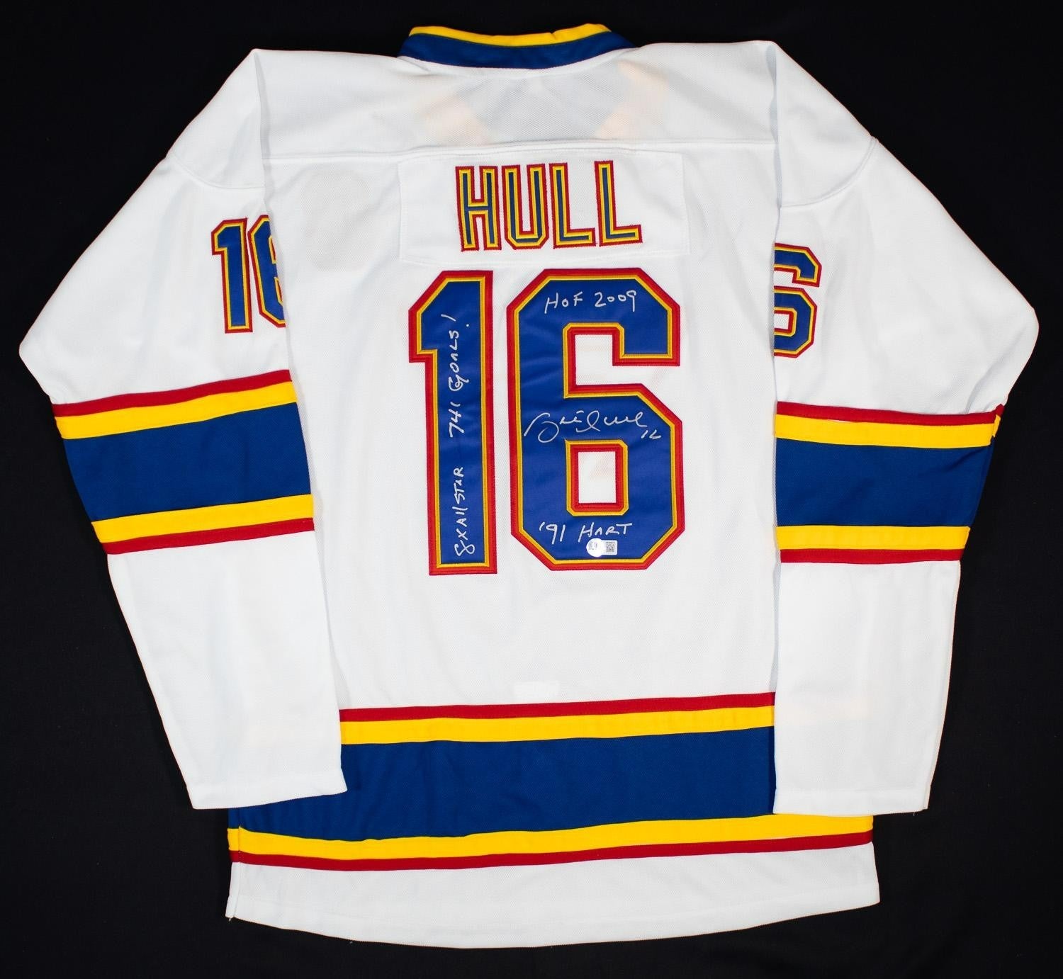on, size XL. Hand-signed and 4xInscribed in silver paint pen by Brett Hull (HOF).