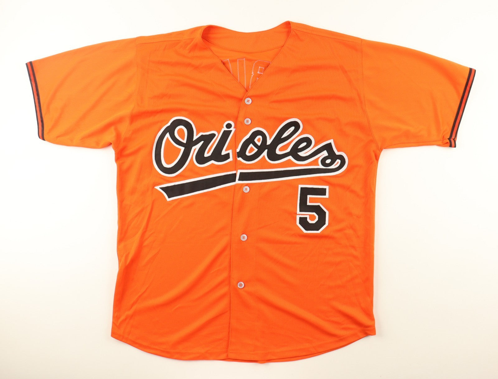 Custom on-field style jersey. Everything is sewn on, size XL. Has been hand-signed and inscribed in silver paint pen by Brooks Robinson (HOF). Signature is imperfect; please see photos.