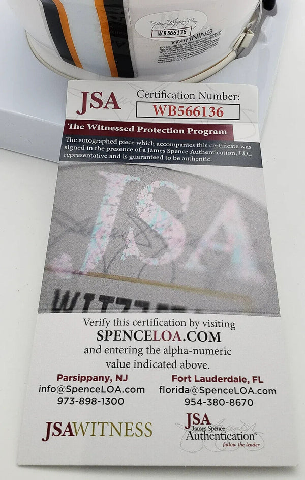 This autographed Riddell Speed mini helmet has been personally hand-signed by CJ Daniels of the LSU Tigers.  This autograph is certified by James Spence Authentication’s (JSA) Witnessed Protection Program. That...
