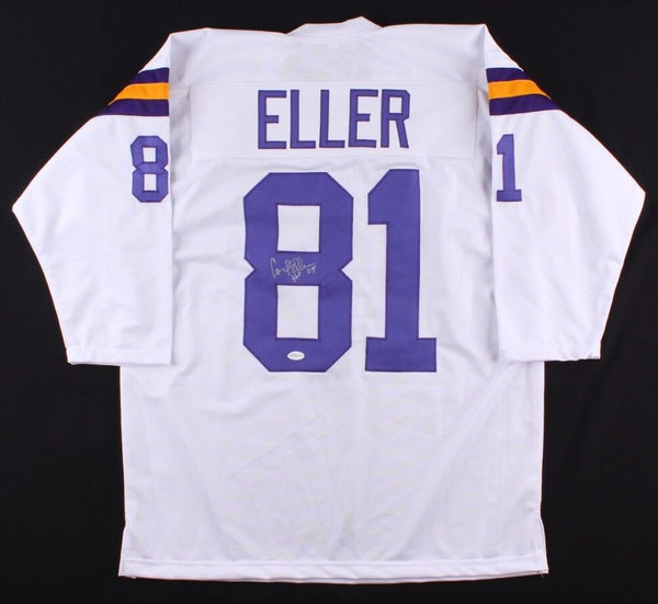 Custom on-field style throwback jersey. Everything is sewn on, size XL. Hand-signed in silver paint pen by Carl Eller (HOF). The lot / autograph(s) includes an official Total Sports Enterprises...