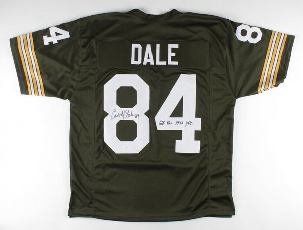 Custom on-field style jersey. Everything is sewn on, size XL. Hand-signed and inscribed by Carroll Dale. The lot / autograph(s) includes an official James Spence Authentication (JSA) hologram and matching...