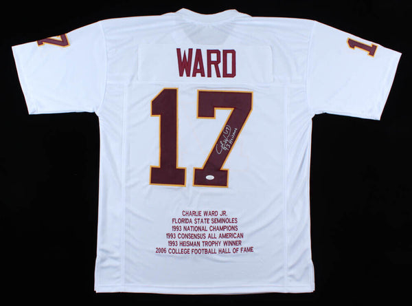 Custom on-field style jersey. Everything is sewn on, size XL. Hand-signed and inscribed by Charlie Ward. Ward's career highlights have been custom stitched onto the back of the jersey below the...