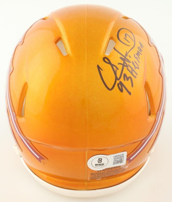 Riddell Florida State Seminoles Flash Alternate Speed mini helmet. Hand-signed and inscribed by Charlie Ward. The autograph includes an official Beckett Authentication Services serially numbered hologram for authenticity purposes. The...