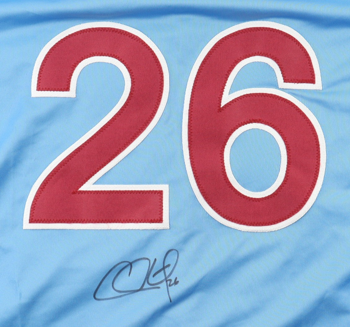 Custom on-field style jersey. Everything is sewn on, size adult XL. Hand-signed by Phillies 2nd Baseman Chase Utley.