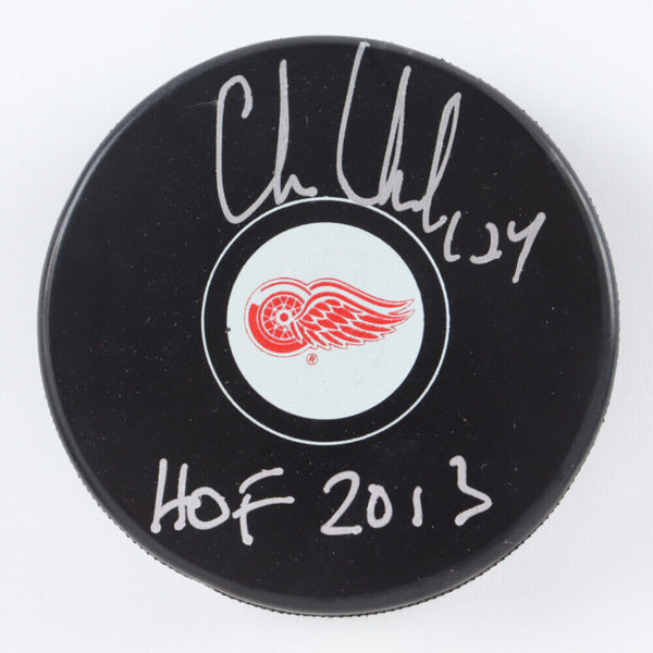 Chris Chelios Signed Red Wings Logo Hockey Puck Inscribed "HOF 2013" (Schwartz)