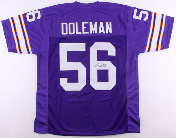 On-field style jersey. Everything is sewn on, size XL. Hand-signed and inscribed in black felt tip pen by Chris Doleman. The lot / autograph(s) includes an official James Spence Authentication...