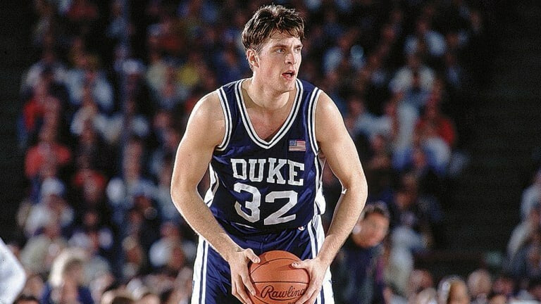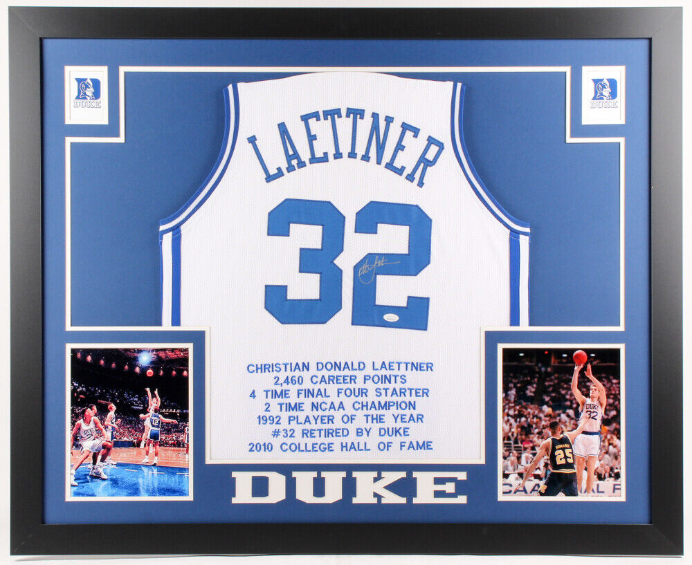 Custom framed display measures approximately 35" x 43" and features a jersey that has been hand-signed in silver paint pen by Christian Laettner. Laettner's career highlights have been custom stitched onto the back of the jersey below the reverse numbers.