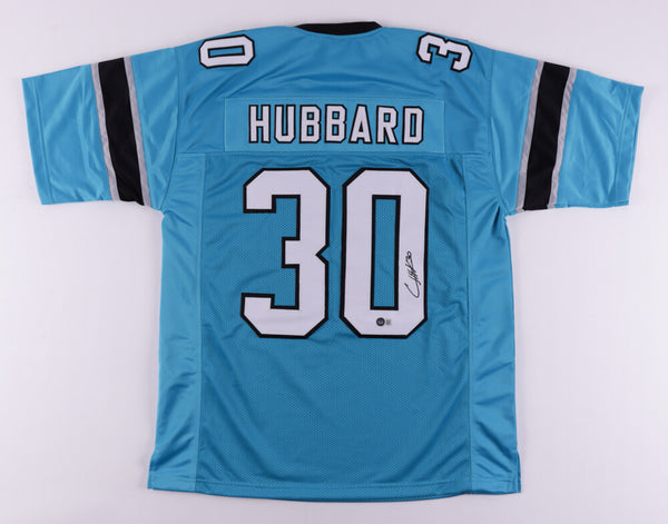 Custom on-field style jersey. Everything is sewn on, size XL. Hand-signed in black felt-tip pen by Chuba Hubbard. The autograph includes an official Beckett Authentication Services serially numbered scannable hologram...