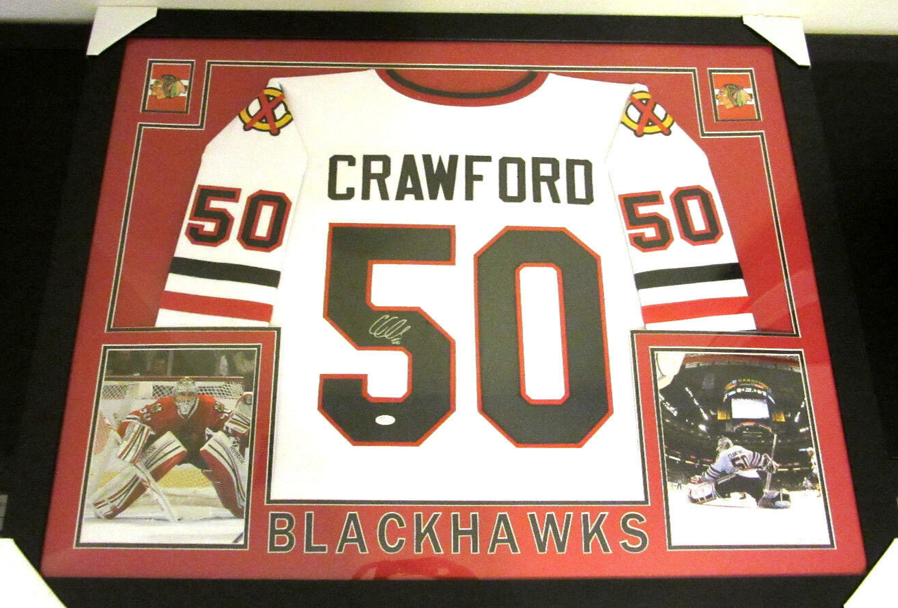 Corey Crawford Signed Blackhawks 35x43 Framed Jersey (JSA COA) 2XCup Champion