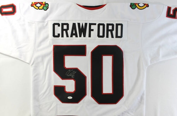 Custom on-field style jersey. Everything sewn on, size XL. Hand-signed in silver paint pen by Corey Crawford (Blackhawks). The autograph includes an official James Spence Authentication (JSA) hologram and matching...