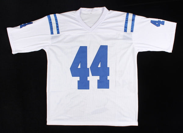 Custom on-field style jersey. Everything is sewn on, size XL. Hand-signed by Dallas Clark.Please note, there appears to be light discoloration near the left sleeve of the jersey and to...