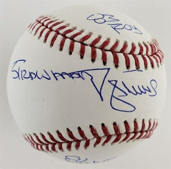 This autographed OML baseball has been personally hand-signed by Darryl Strawberry of the New York Mets. Strawberry added the inscriptions "83 NL ROY", "4x WS Champs," "Strawman" and "8x All-Star"...