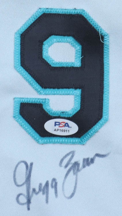 Russell Athletic Diamond Collection jersey. Everything is sewn on, size 44. Hand-signed by Gregg Zaun (Florida Marlins). The lot / autograph(s) includes an official PSA/DNA hologram with QR Code Card...