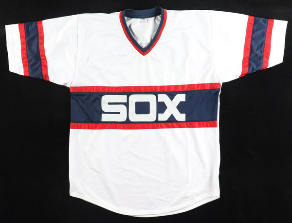 Custom on-field style 1983 Throwback jersey. Everything is sewn on, size XL. Hand-signed and inscribed by Harold Baines (HOF). The autograph includes an official James Spence Authentication (JSA) scannable hologram...