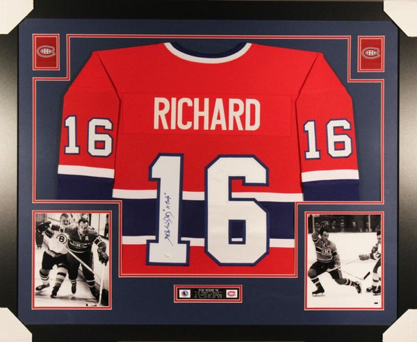 Custom framed jersey display measures 35.5" x 43.5" in size and has been hand-signed in blue felt-tip pen by Henri Richard (HOF).The autograph includes an official James Spence Authentication (JSA)...