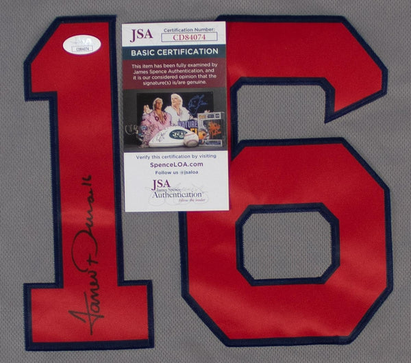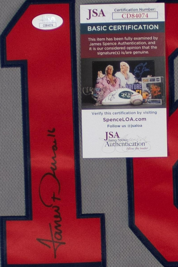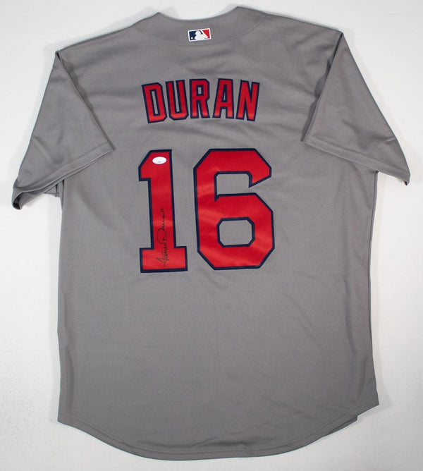 Custom on-field style jersey. Everything sewn on, size XL. Hand-signed in black sharpie pen by Jarren Duran. The autograph includes an official James Spence Authentication (JSA) hologram and matching COA...
