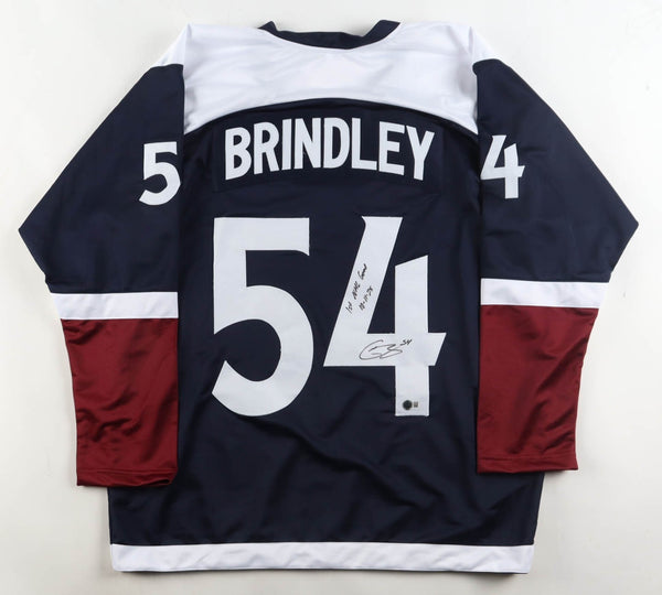 Custom on-ice style Colorado Rockies / Avalanche Throwback jersey. Everything sewn on, size XL. Hand-signed by Gavin Brindley. The autograph includes an official Beckett Authentication Services serially numbered scannable hologram...