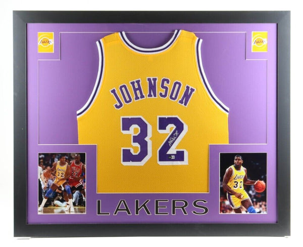 Magic Johnson Signed Los Angeles Lakers 35x43 Framed Jersey (Beckett) 5xChampion